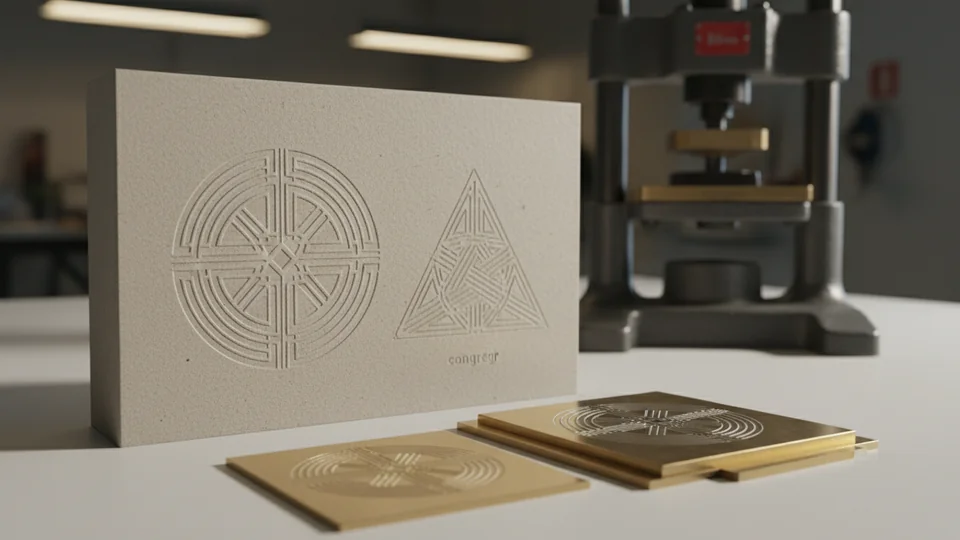 Создаёт выпуклый рельеф без фольги за счёт пары клише — матрицы и пуансона. Подходит для гербов, эмблем и крупных элементов, когда нужен объём и тень.